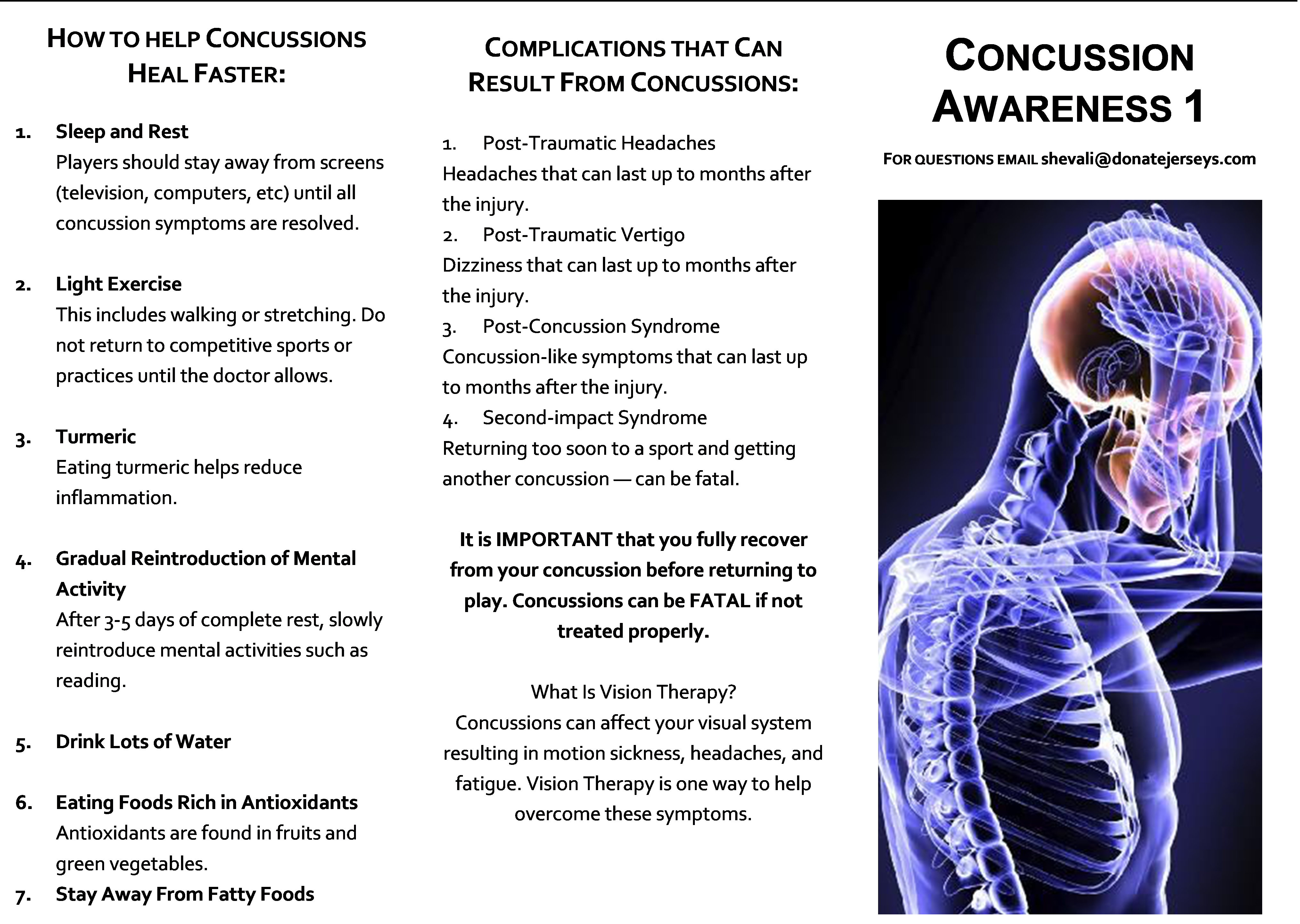 are and how unaware parents are about the consequences of a minor head injury. I am now ready to talk about my journey and would like to now bring awareness about this problem to the district and to all the schools. Not only would I like to share various experiences about concussions to our community and make people aware of its dangerous side effects, but also would also like to recommend measures that the district can take to prevent concussions.